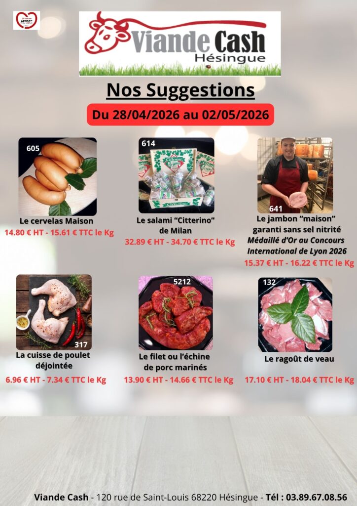 Accueil juin 26, 2025 / Chaque semaine nous vous proposons des suggestions en fonction des saisons et de vos envies. Laissez-vous guider par un choix divers et varié, n’hésitez pas à nous contacter pour plus de renseignements. Nos Suggestions de la semaine